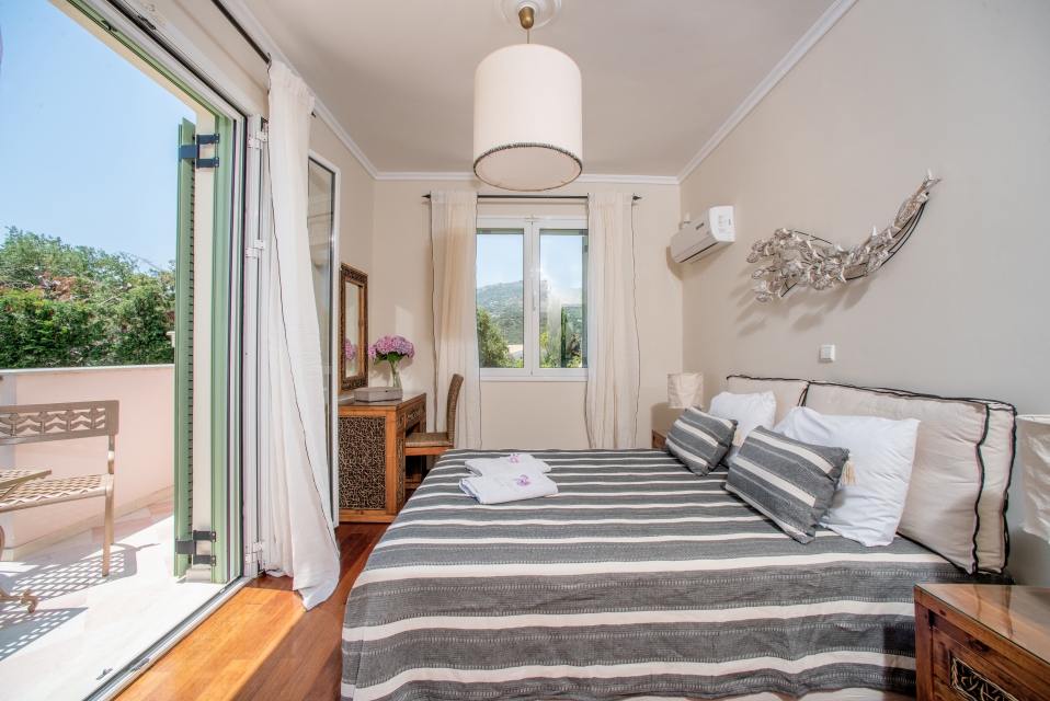 Bedroom 2 with twin beds, ensuite bathroom, doors to terrace gardens, air conditioning cold heat