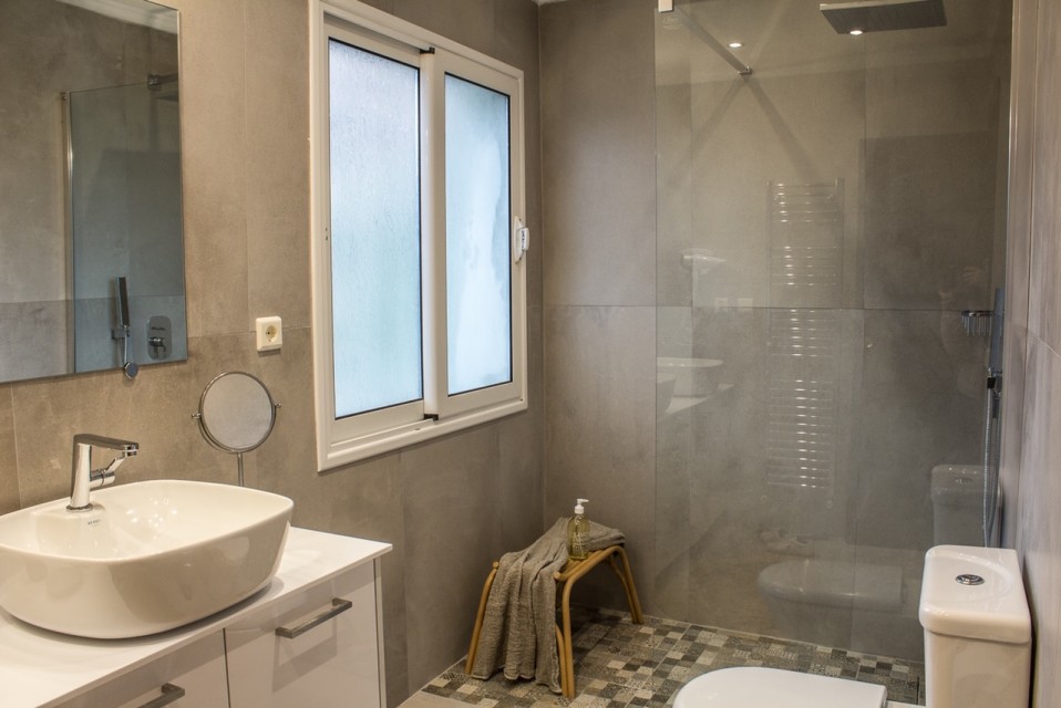The first floor has the main living room with fireplace, a WC and a fully equipped kitchen. All three bedrooms of this floor have independent bathrooms and balconies.